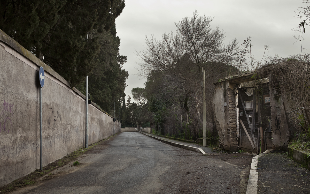 Via Trionfale (a destra nella foto) / via Carlo Belli (a sinistra) – Al termine di una leggera discesa una curva verso destra molto brusca e poco visibile permette alle tre automobili di imboccare via Carlo Belli, una via privata quasi nascosta alla normale viabilità, la Fiat 128 che funge da battistrada sbaglia la curva ed è costretta a fermarsi per fare manovra, venendo superata dalle altre due automobili.